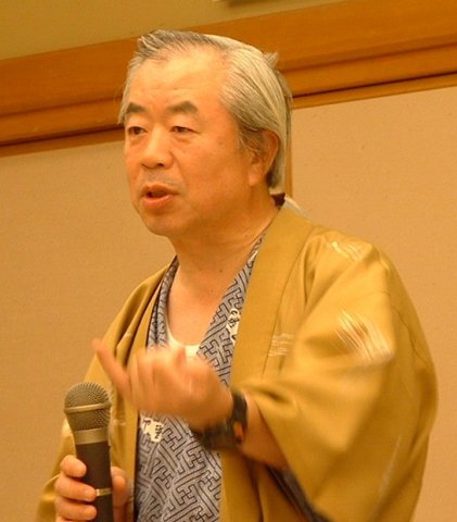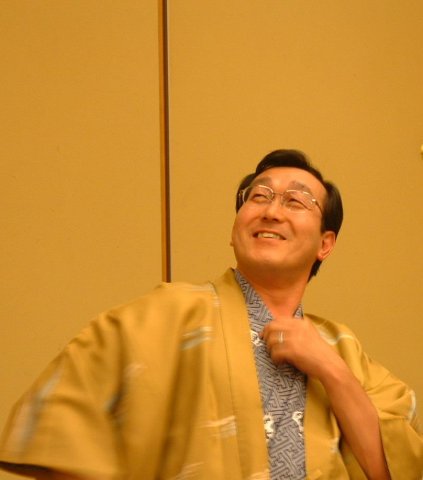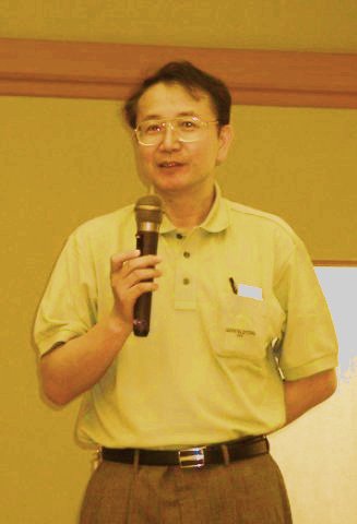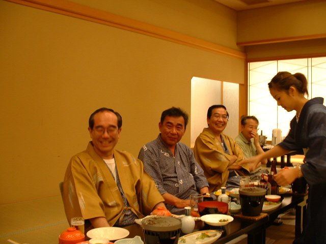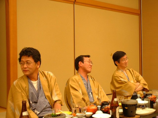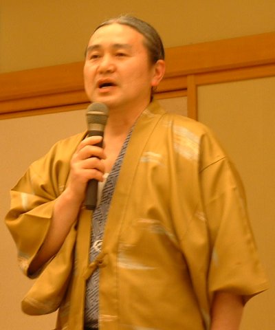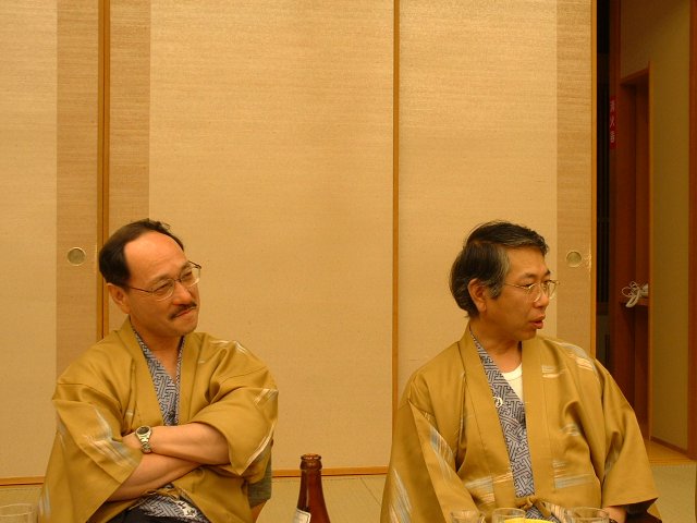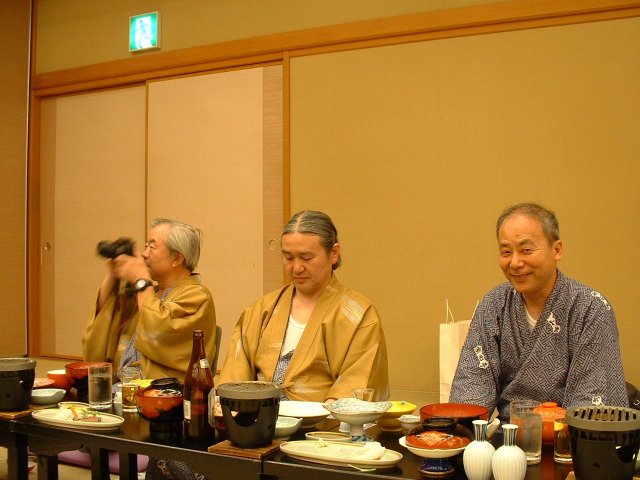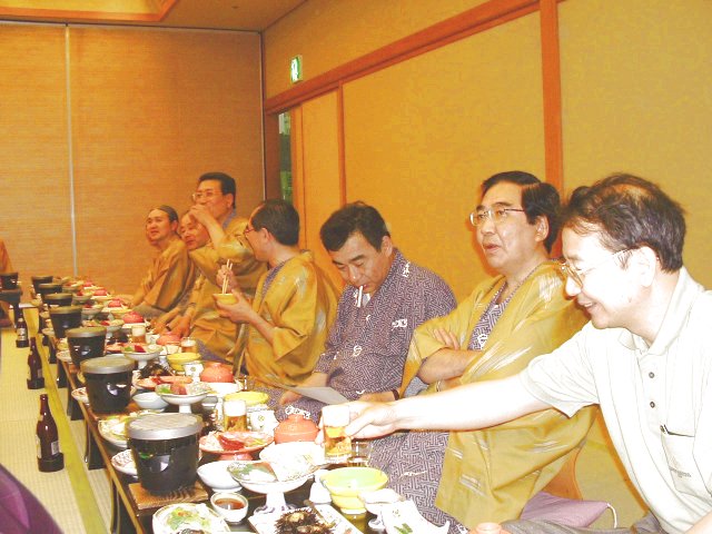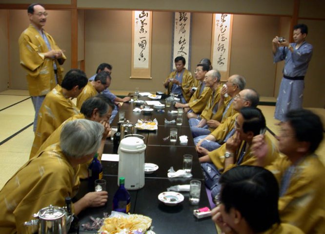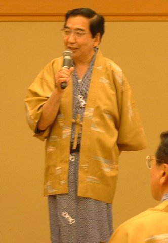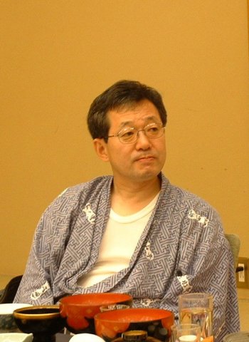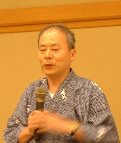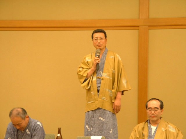 2次会で挨拶する山田 均、立ってカメラ構える小林秀雄と中央奥の澤藤隆一