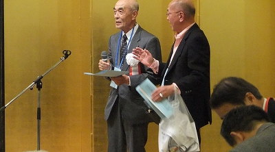 ![]() 壇上の表彰者に下の席から表彰楯を渡す柏葉会長 |