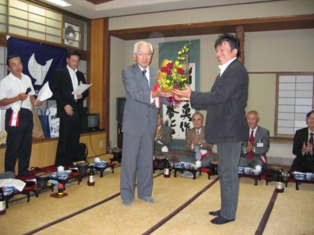 左から叙勲者紹介の澤藤隆一支部長と進行の山内利明副支部長花束贈呈者は三浦友規さん(H16院卒、最も若い人) |