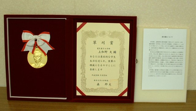電気科初代科長、第4代、第7代工学部長として岩手大学の発展に貢献された草刈遜(ユズル)先生のご生誕100年記念事業(→クリック)の一環として、記念事業実行委員会からの寄付により、基金240万円をもとに創設された賞です。創設時の草刈賞委員長は太田原 功先生でした。草刈先生の教えを後世に伝えるとともに、意欲的な学生生活を送った者を表彰し、その栄誉を称えることを目的としています。毎年電気電子工学科、情報システム工学科の学生の中から、模範となる学生生活、後輩の目標となる学生生活を送った者それぞれ3名以内、計6名以内を卒業時選考して表彰します。