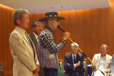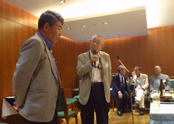 | 懇親会 | 参加者全員が卒業年次ごとに近況や学生時代の思い出話しなどユーモアに富んだスピーチをされ、終始和やかな雰囲気のうちに中締めとなりました。 今回退任された松本支部長から、昨年の電気電子情報科会創立70周年記念祝賀会(アルカディア市ヶ谷)にご出席いただいたときの記念品であるDVDやCDのできばえが素晴らしかったと、ご挨拶の中で絶賛され、受付中のBGMや最後の学生歌の合唱に当該CDをお使いいただきました。また、懐かしい逍遥歌なども収録されている、とご紹介いただきました。 |